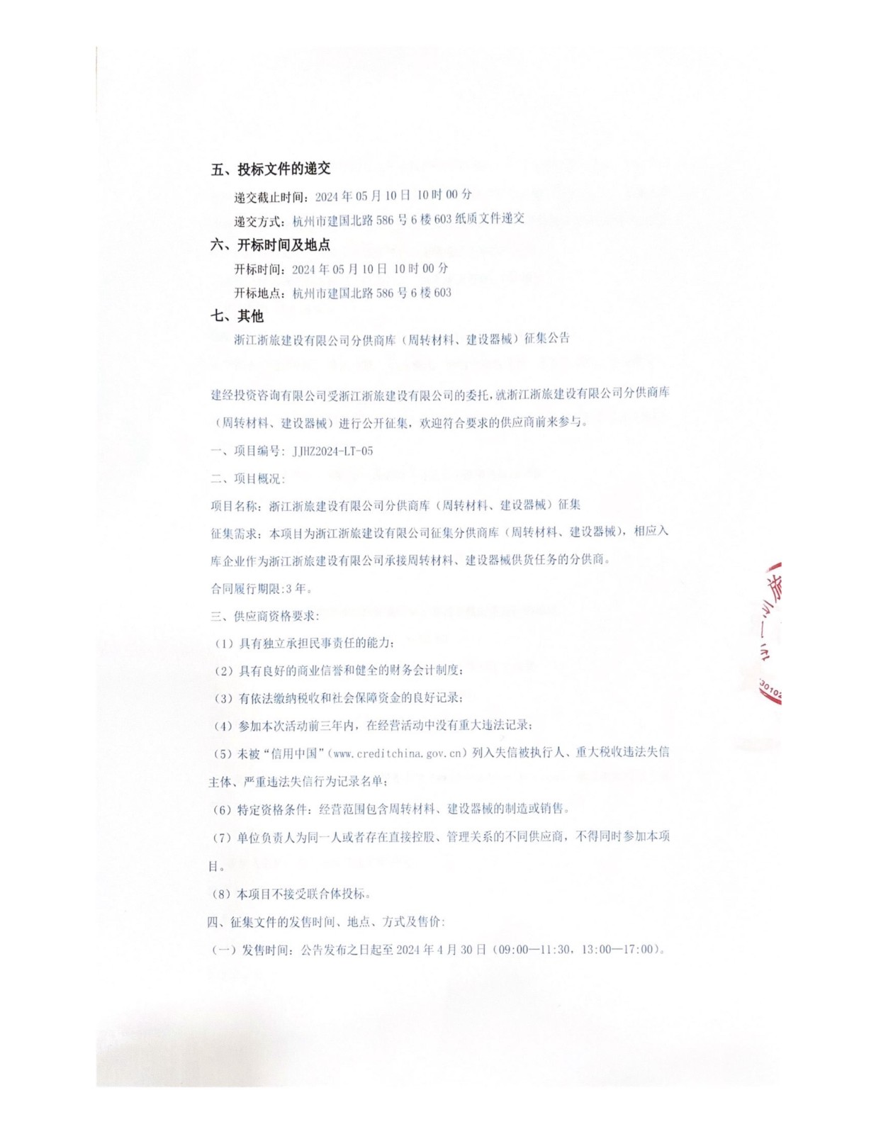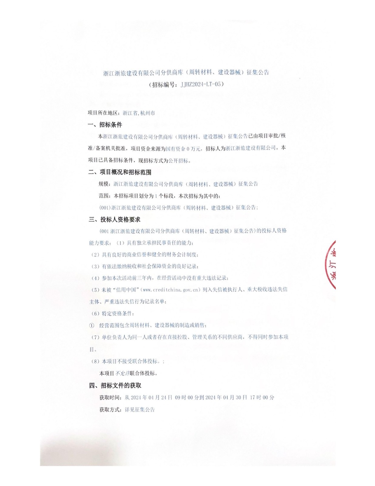 浙江浙旅建設(shè)有限公司分供商庫(周轉(zhuǎn)材料、建設(shè)器械)征集公告