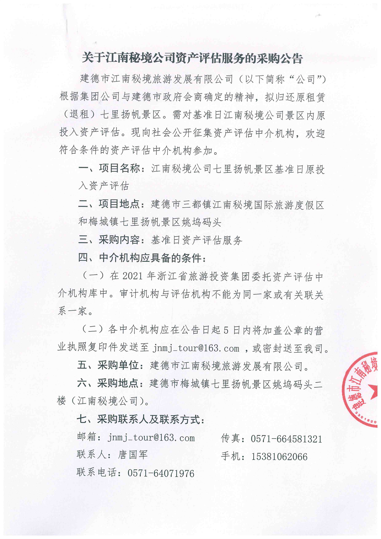 關(guān)于江南秘境公司資產(chǎn)評估服務(wù)的采購公告