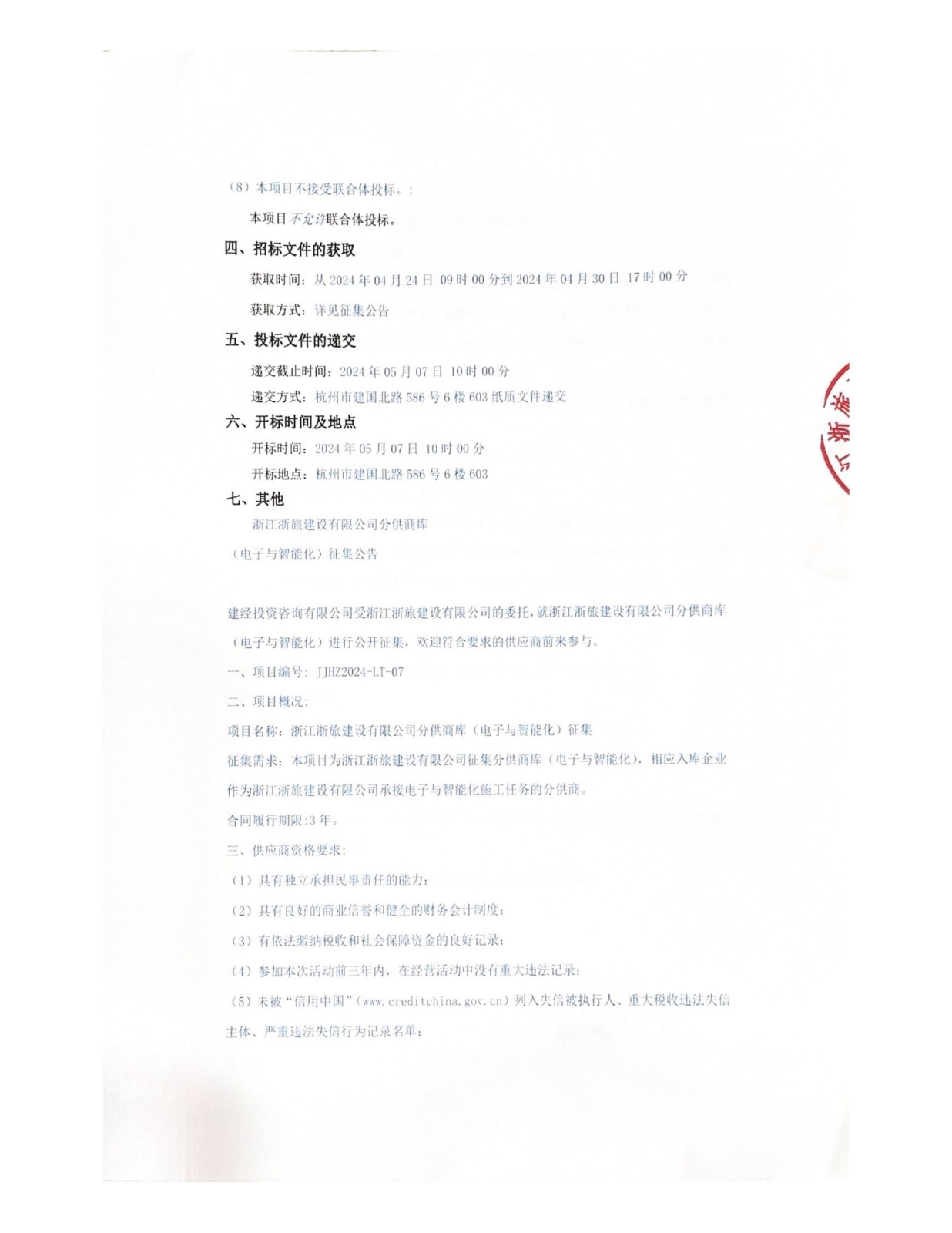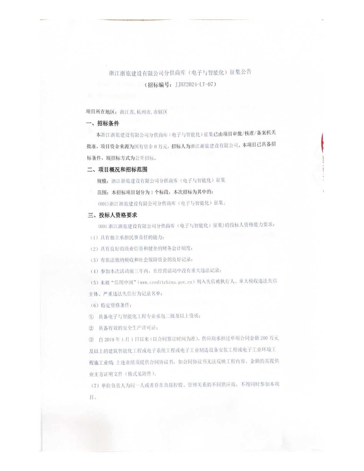 浙江浙旅建設(shè)有限公司分供商庫(電子與智能化)征集公告
