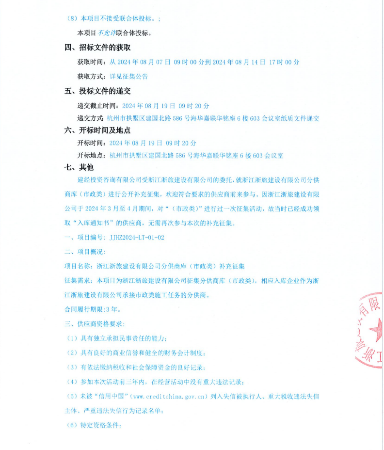 浙江浙旅建設(shè)有限公司分供商庫(市政類)補(bǔ)充征集公告
