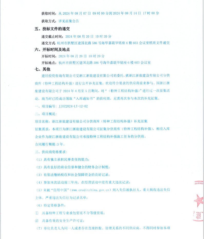 浙江浙旅建設(shè)有限公司分供商庫(kù)(特種工程結(jié)構(gòu)補(bǔ)強(qiáng))補(bǔ)充征集公告