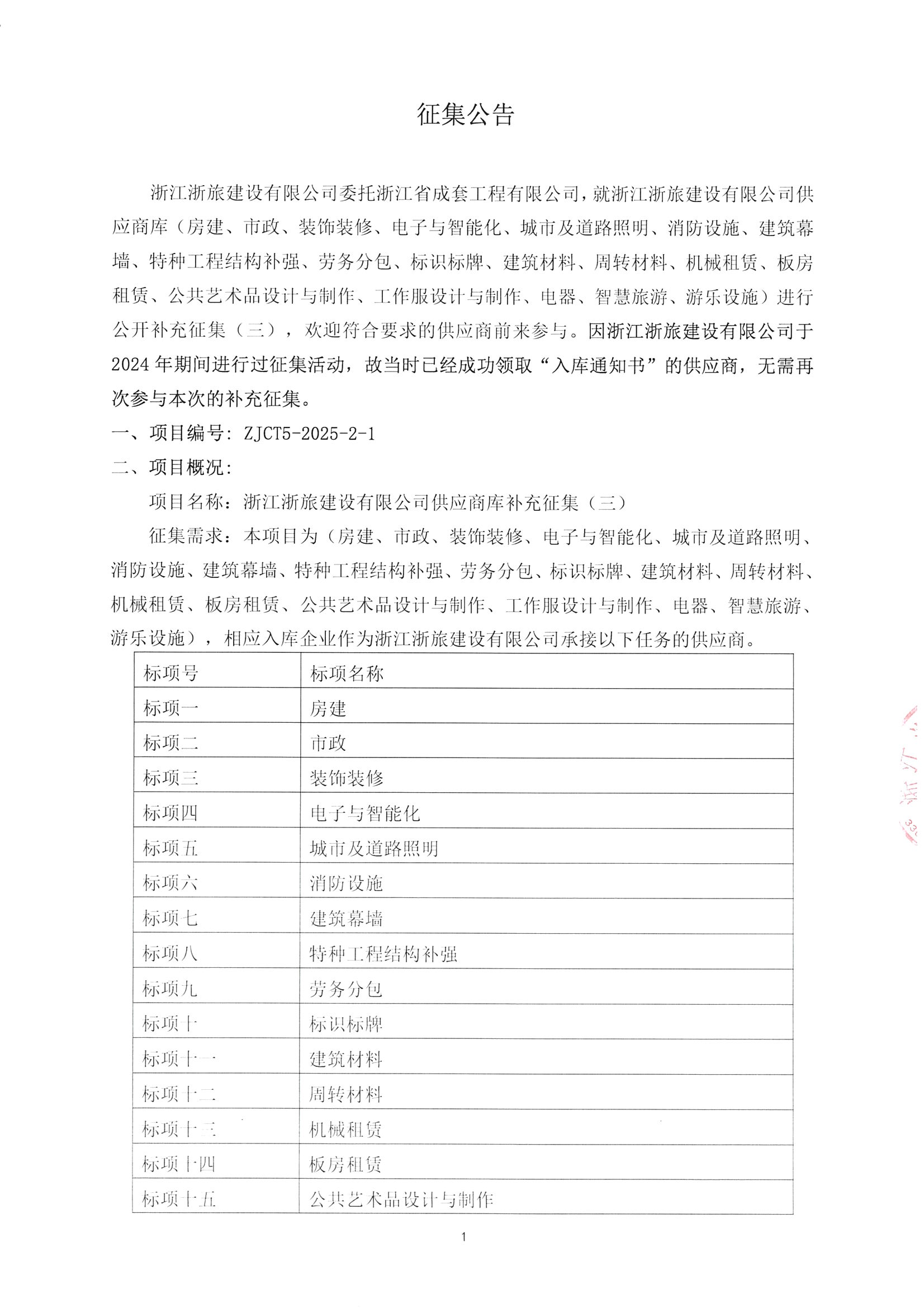 浙江浙旅建設(shè)有限公司供應(yīng)商庫補(bǔ)充征集(三)征集公告